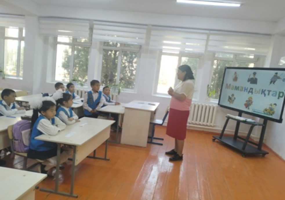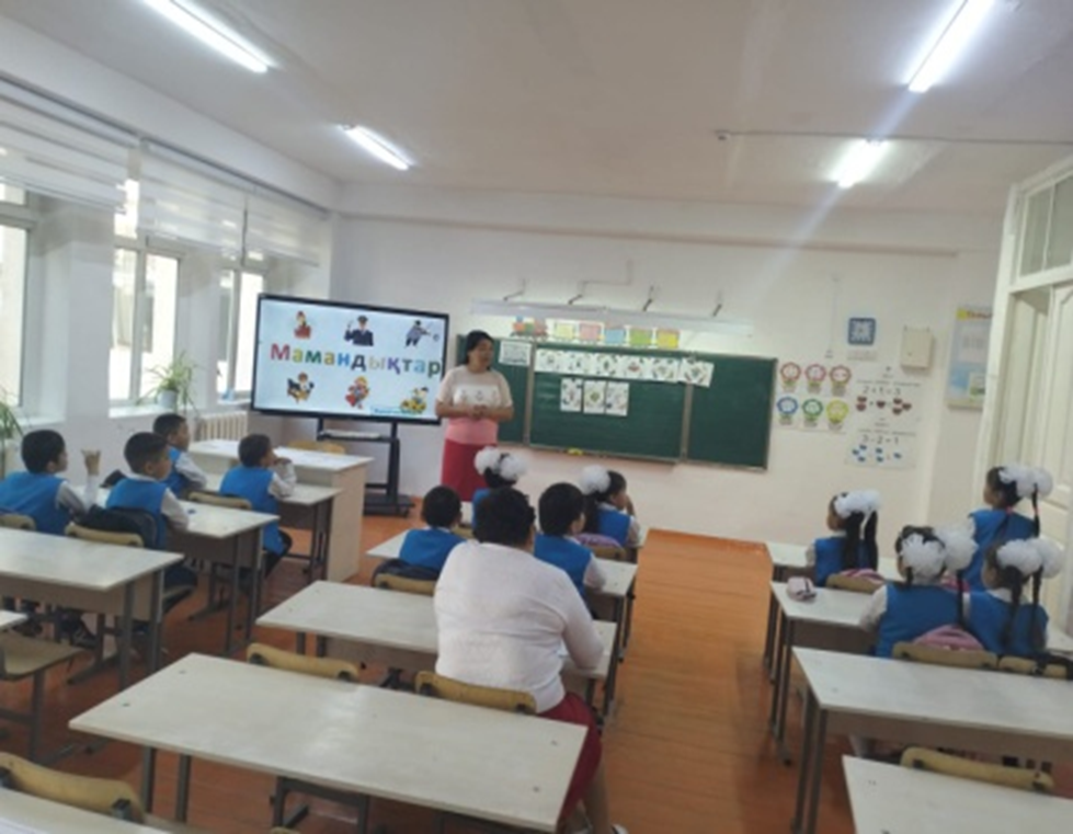 Оқушылардан мамандықтың түрлері туралы сұрады, мақал-мәтелдер айтқызды. «»Мамандық әлемінде» бейне ролик көрсетті. Тақпақтар айтқызды, «Дұрыс па?, Бұрыс па?» ойыны арқылы оқушылардың мамандық түріне деген қызығушылығын оятты.