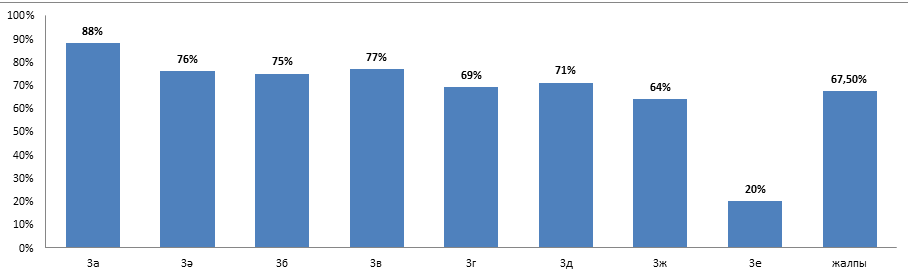 жалпы | 186 | 39 | 93 | 53 | 3,8 | 64% | 69% | 69% | 67,5% | 100% | ||