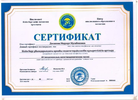 08.08- 10.08.2022ж аралығында Қазақстандық қайта даярлау және біліктілікті арттыру орталығынан «Білім беру ұйымдарындағы арнайы педагогтердің кәсіби құзыреттілігін арттыру» тақырыбында 40 сағаттық курсынан өттім.