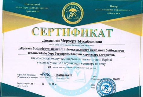 06.06-09.06.2022ж аралығында Қазақстандық қайта даярлау және біліктілікті арттыру орталығынан «Ерекше білім беруді қажет ететін оқушыларға жеке және бейімделген жалпы білім беру бағдарламаларын құрастыру алгоритмі» тақырыбында 24 сағаттық біліктілікті арттыру курсынан өттім.
