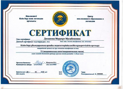 26.01-29.01.2023ж аралығында Қазақсатандық қайта даярлау және біліктілікті арттыру орталығынан «Инклюзивті білім берудің әдістемелік- ұйымдастырушылық негіздері» тақырыбында 72 сағаттық біліктілікті арттыру курсынан өттім.