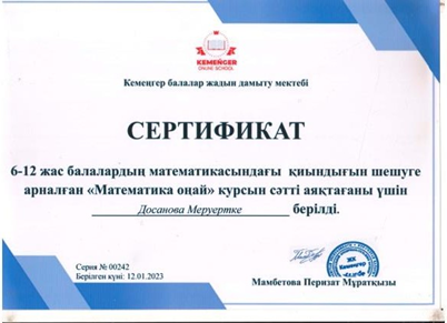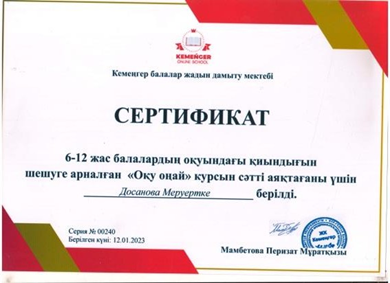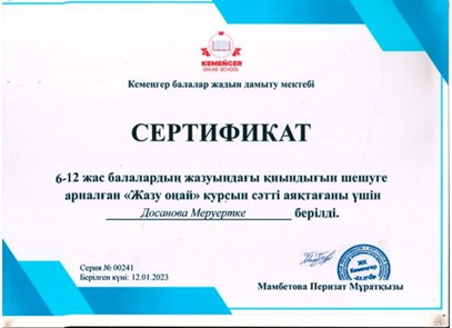 2022ж қараша айында Астана қаласынан «Кемеңгер бала жадын дамыту» орталығынан 6-12 жас балалардың жазу, оқу, математика оңай курсын оқып, сертификат алдым.