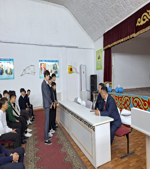 Шара аясында білім беру ордасында 9-10-11сынып оқушыларымен құқық бұзушылықтың алдын алу, ұлт аралық жан жалға жол бермеу, жол ережесін сақтау, ата-ананы жасы үлкенді құрметтеу, отбасылық құндылықтарды дәріптеу тақырыптарында тәрбиелік жұмыстар ұйымдастырылады. Қосымша, қала көлеміндегі ұйымдармен бірлесе күндізгі және түнгі рейдтік жұмыстары жүретіні туралы ескертеміз! Осы аталған тақырыптар төңірегінде мектеп оқушыларына жауапты инспекторымыз Айбат Болатқызы арнайы түсіндірме жұмыстарын жүргізді. Балалар жол ережесіне байланысты керекті мағлұматтар алып, сұрақ алмасу арқылы жиналыста өздеріне біраз ақпараттар алды.
