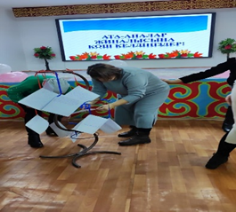 Cынып жетекшілер ата – аналарды күтіп алып сәлемдесіп жайғастырды . Ата- аналар толық келіп болған соң оларды топқа бөліп өзеріне берілген шақыру қағаздарымен өздеріне үлестірілген конфеттер арқылы екі топқа бөліп отырғызды. Келесі кезекте ата- аналарға әрқайсысына өздерінің балаларының бас әріпімен басталатын үш түрлі сөзбен еркелететіндерін айтып шықты.Сауалнама бойынша; Мен баламды танимын , Додекаэдр , әдісі ситуациялық сұрақтар қойылу арқылы әртүрлі әдістер пайдаланып сауалнама алып шықты .Оқушылардың жазған хаттарын іліп қойған тақташаға әр ата – аналар алып оқып шықты. Ермек саздан құрт жасау әдісі бойынша, әр кім әр түрлі формадағы құрт жасап шықты мұндағы мақсат жұмсақ кезде құрттың қалай илесе солай иленетінін көрсетіп тұрғанын жасап шықты. Жалпы бұл ата- аналар жиналысының мақсаты отбасы қашанда бала тәрбиесінің айнасы екенін сондықтанда мына қарқынды дамыған заманда бала тәрбиесіне барынша көбірек көңіл бөліп уақыттан қалып кетпеу туралы айтылды . Бала ата ананың айнасы сонымен бірге көз қуанышы екенін ұмытпайық . Жиналыс соңында директордың тәрбие ісі жөніндегі орынбасарлары Б.Тлеубеков пен Н.Оразгелдиева ата - аналарға алғыстарын білдіріп, оқушыларға көбірек көңіл бөлулерін айтып өтті. Мектеп психолгтары ата – аналармен тренингтер жүргізіп көтеріңкі көңіл күймен шығарып салды .